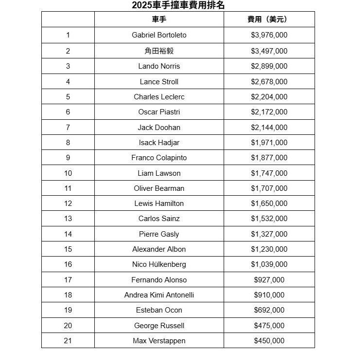今年維修費用最高的車手是Sauber的新秀Bortoleto,儘管在賽季中展示出不錯的速度,他仍有5次退賽,其中主場聖保羅站的嚴重事故是他的維修費上探接近400萬的主要原因。