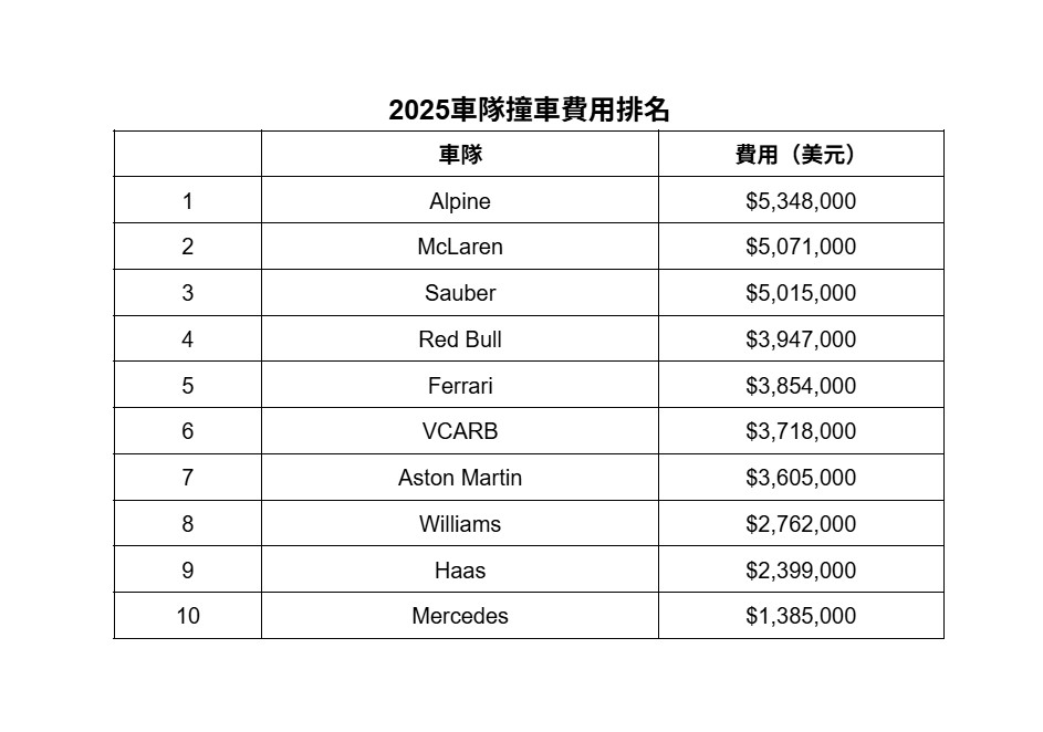 2025 F1賽季已經結束,車手和車隊世界冠軍也已經有了得主,並在上周的FIA年度頒獎典禮中正式授予冠軍獎項,但還有一個非官方的車手和車隊排名值得留意,便是維修費用排行榜。