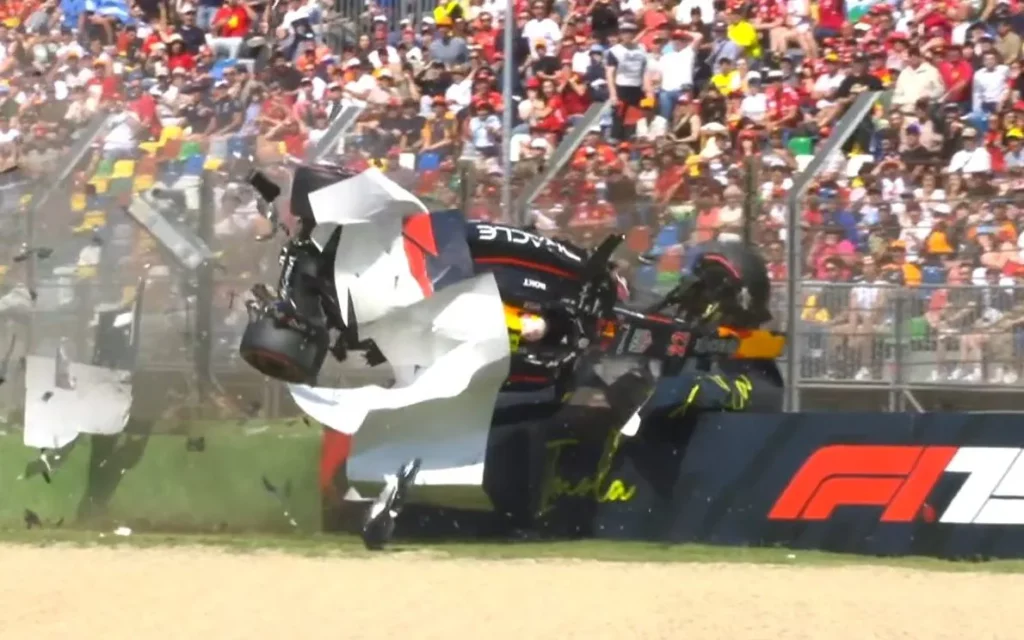 Bortoleto在衝刺賽最後一圈的T1打算抽入內綫進攻前面的Alex Albon時,因駛上濕滑的非賽車綫導致賽車高速打滑失控,先是右側車身撞向維修站護牆,再沿著賽道滑行騰空,並以接近340公里/小時的速度撞向緩衝區的護欄,撞擊力高達91G,幾乎整部賽車全毀,這也是本賽季最嚴重的撞車事故。