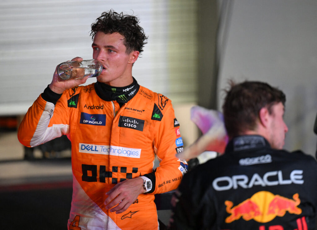 Lando Norris在贏得2024年新加坡大獎賽後馬上補充水分