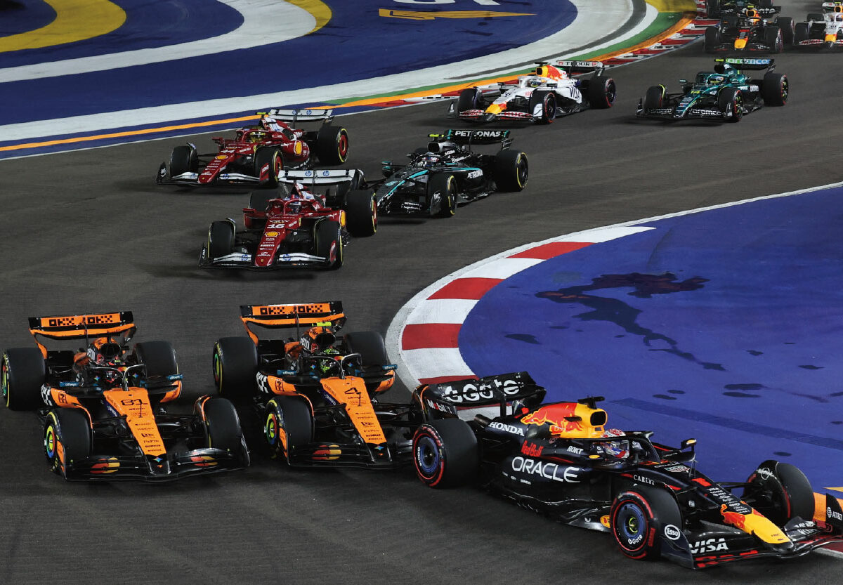 在新加坡站正賽起步時,排第5位的Norris於T2上升至第4位,並在T3內綫與Piastri平排,但Norris在T3彎心碰到前方Max Verstappen的車尾,Norris嘗試避開Verstappen的時候與外綫的Piastri出現輕微碰撞。
