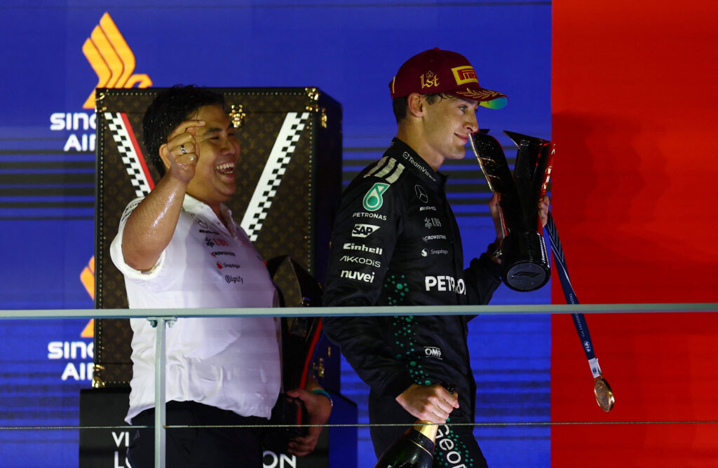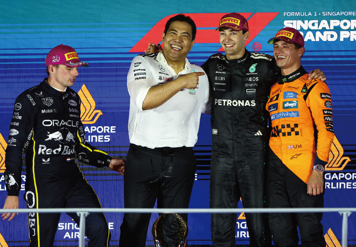 上周末的新加坡大獎賽由Mercedes車手George Russell奪得冠軍,而代表車隊上頒獎台領取車隊冠軍獎盃的正是Tengku Muhammad。就在完成頒獎儀式後,三甲車手Russell、Max Verstappen和Lando Norris開始噴灑香檳,Tengku Muhammad亦樂在其中,並被香檳噴灑至全身濕透,隨後再度與3位車手合照。
